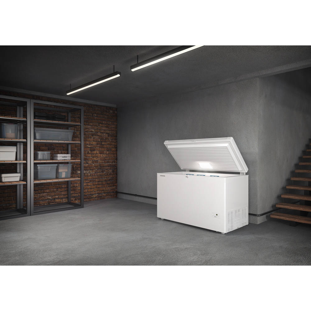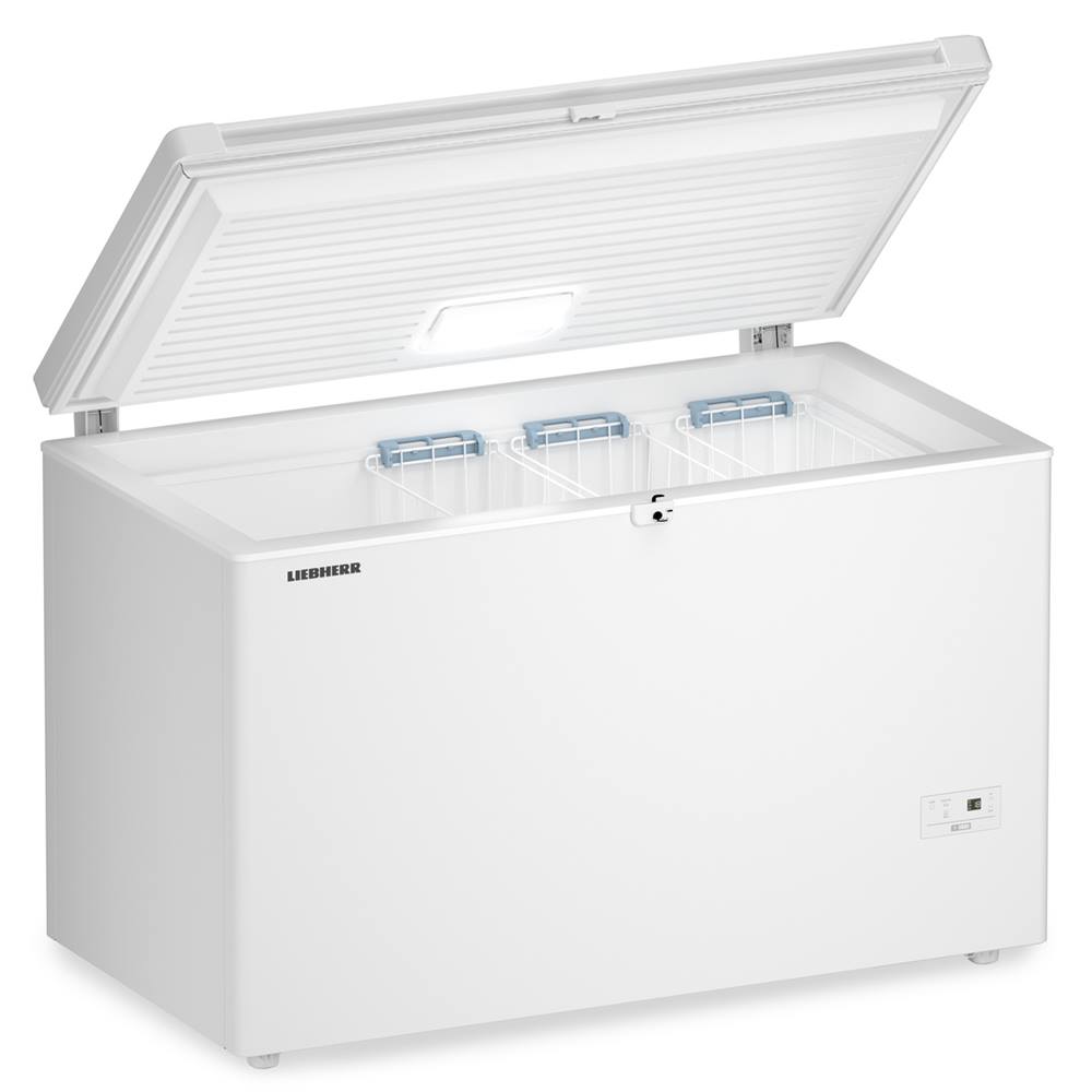 Weißer Gefrierschrank von LIEBHERR mit geöffnetem Deckel und Einlegekörben im Inneren. Bedienfeld an der rechten Seite.