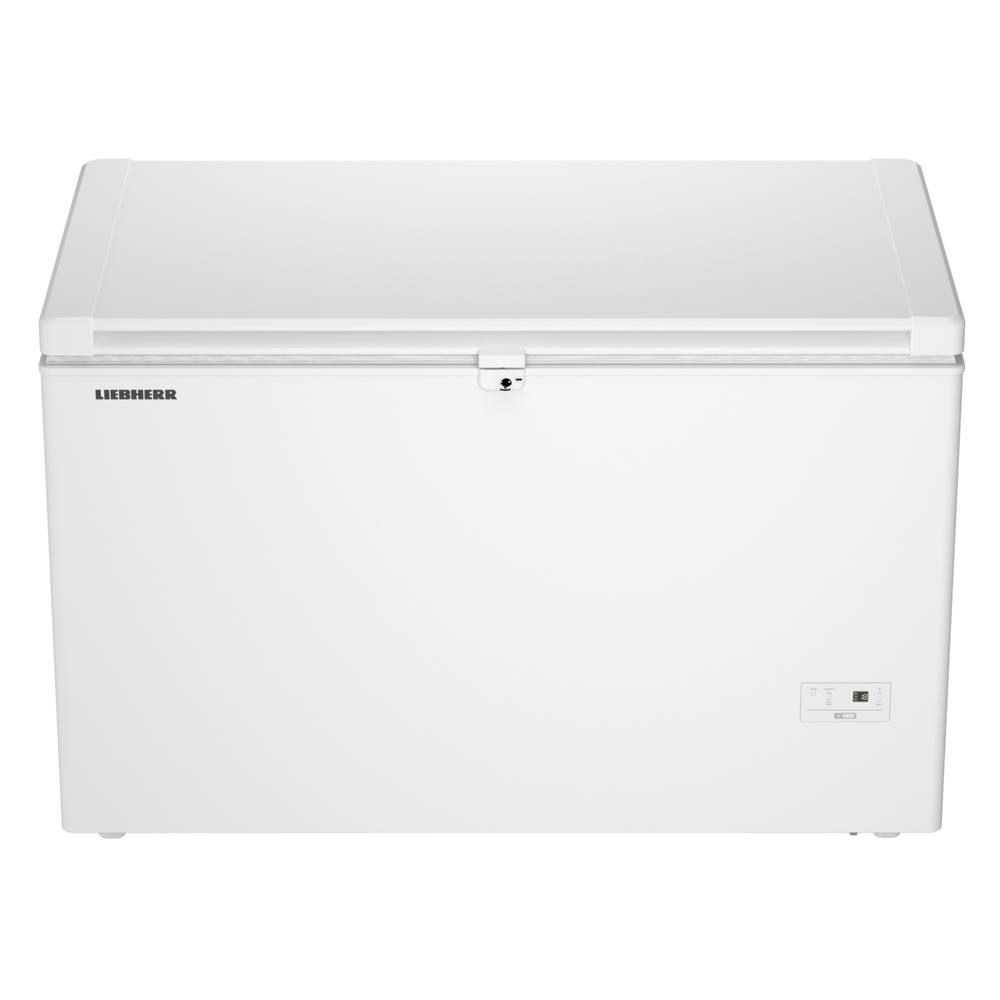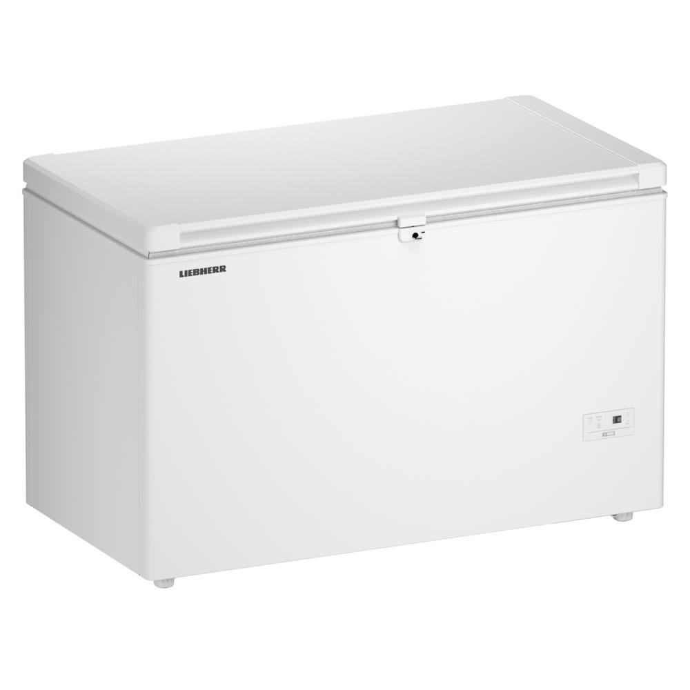 Weißer Gefrierschrank der Marke LIEBHERR mit Schloss und Bedienfeld. Rechteckige Form, horizontale Öffnung.